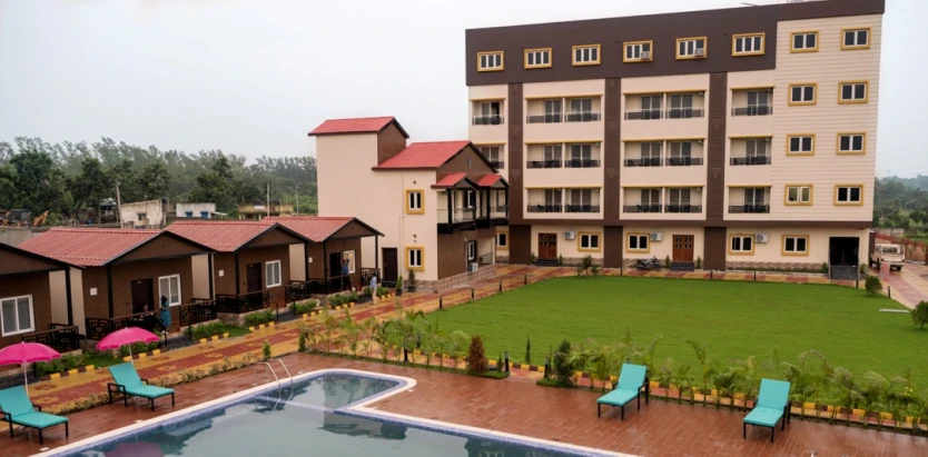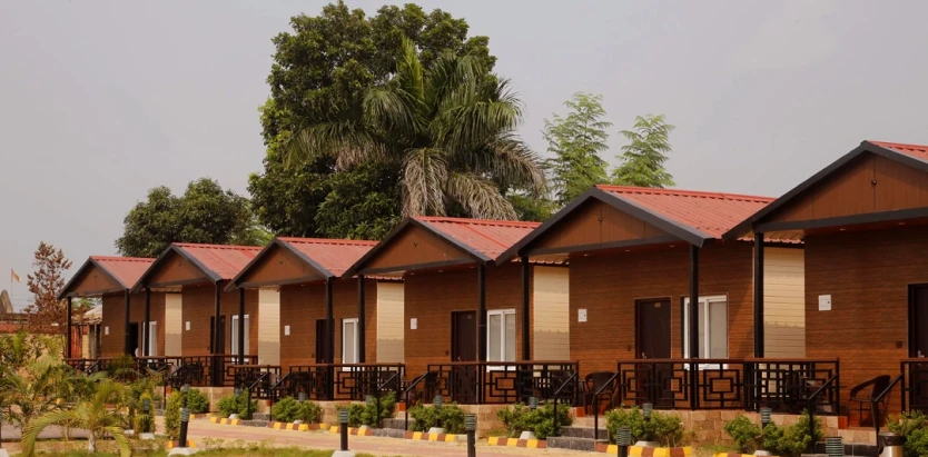 Jharna resort is a peaceful stay option in Tadoba, which is just at a distance of around 400 metres from the Navegaon gate. This resort features sapphire cottages, cottages, and premium rooms as accommodation options. All the rooms and cottages of this resort are well equipped with a coffee table, a comfy bed, a working desk, a chair, private bathrooms, AC, intercom facility, a small verandah, a private space where a family meal can be shared, and a safe deposit locker with many more amenities. This Jharna resort has wifi, indoor games, an open gym area, a conference hall, a children’s play area, and many more facilities. There is also an in-house restaurant where you can go and have some tasty meals. You can all enjoy rain dancing here and laugh out loud with your friends and family. If you’re tired after a thrilling safari ride, then relax in the swimming pool. This luxurious resort also offers tourists the opportunity to try Archery in its open grounds, so that you can spend your free time learning a new skill.